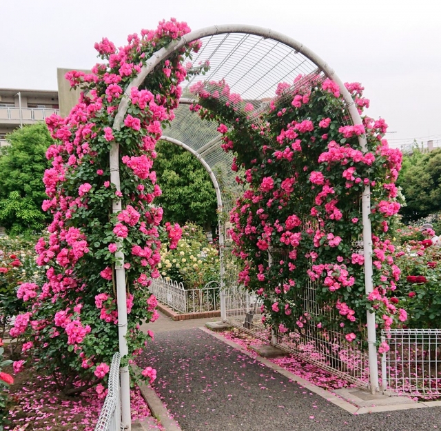 バラの開花シーズンには、近所の人がお散歩に来たり、通行人が普通につっきったりするような公園です。