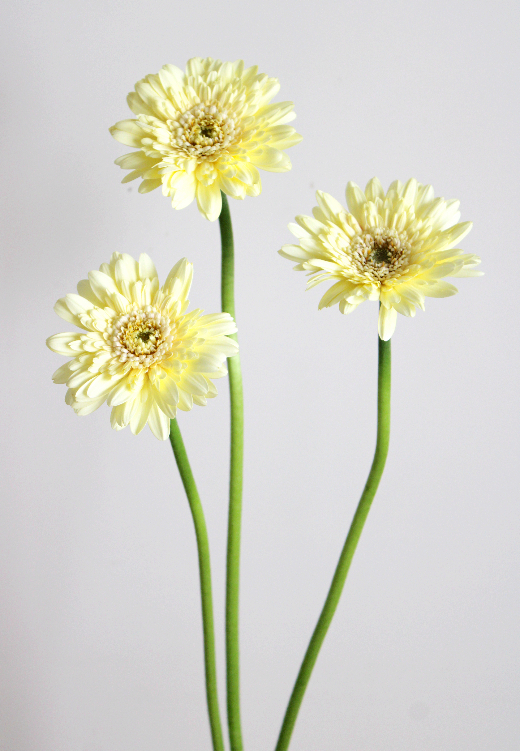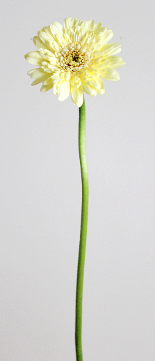 自分が使った花材事典:ガーベラ(クリームイエロー・八重)2025年10月8日 これ、今日のうちの稽古花だったものです。 3本、ってところがお稽古花ぽいですよね。 ガーベラは、もう何品種アップしたか分かりません。ガーベラの世界は深遠であります。 足長で、花径はわりと小ぶりでした。 引き締まって、だらしなくない開きで、良いと思います。 色合いとしては、白に近いような薄黄でした。レモンイエローよりももっと薄かったので、タイトルには「クリームイエロー」としています。 自分が使った花材事典Posted by sei