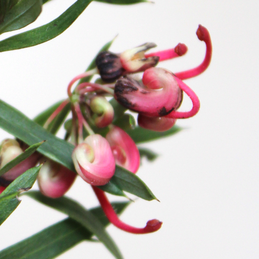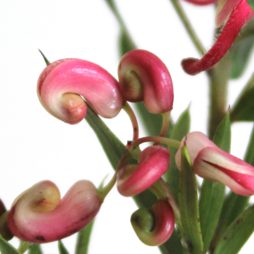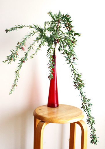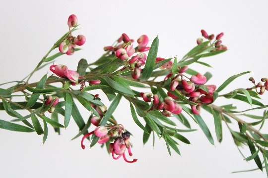 私は、グレビレアといえば鉢物・植木の方がなじみがあるんですが、こんな風に大きくしなる枝の鉢は見たことありません。