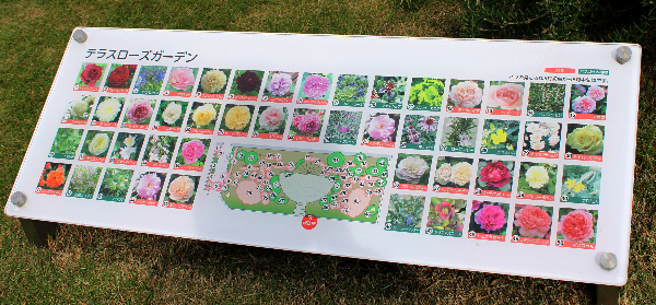 ローズガーデンのバラは、およそ70くらいの品種数です。下のような、バラの品種マップが数か所に設置されています。