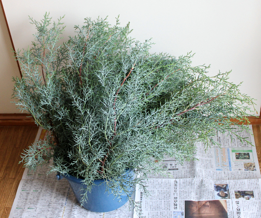 バケツにいっぱいのブルーアイス。全部で、15本くらいありました。これを使って、ガーランド、リース、スワッグなど、いろいろ作りました。