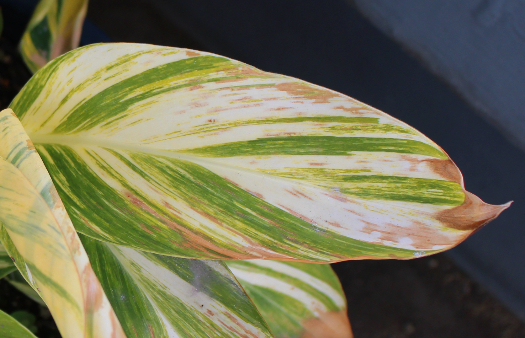 上の画像は月桃の葉。茶色いシミが出ているのは、寒さのせいだと思われます。東京に雪が降った日から、こんな感じに株全体にシミが出始めました。
