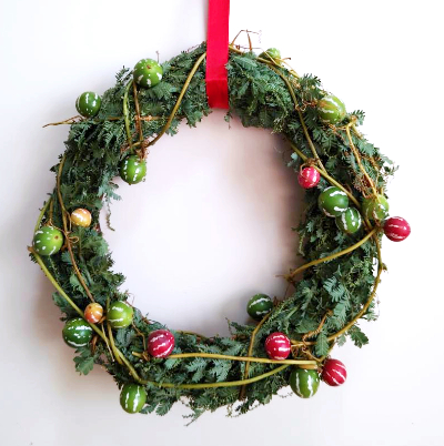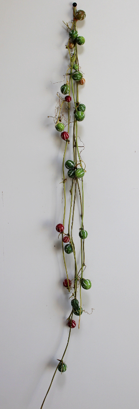じゃあ、もともと赤かった実はどうなるかと言うと、熟しすぎてダメになります。なので、スズメウリをリースにして飾ると、たまにダメになった実をつまんでいくことになります。