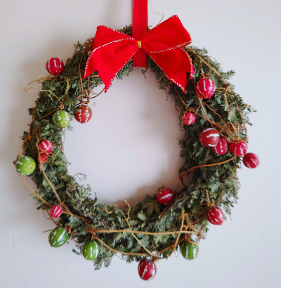 完熟した実をつまんでいくと、一カ所だけ実が無いスカスカの場所ができたりするもので、そうなったら蔓をかけかえて、実の配置を買えます。そのため、二枚のリース画像は、蔓と実の配置が微妙に違っているのです。