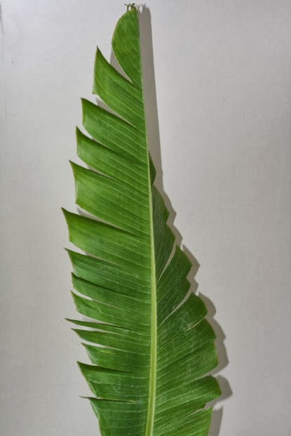 知らない方は、「わりと普通の葉っぱでは?」と思われるでしょうが、この葉っぱは大きさがあるんです。画像の品物は、大体60cmくらいで、イトバショウとしては、むしろ小振りの方です。大きいものは、1mを超えてきます。この大きさを生かして、広い面を作ることも出来ますし、高さを出すことも出来ますし、折ったり曲げたりして表情を作ることもできます。とにかく大きいので、何をさせても「大技を決めた」感じになります。そういうところが、いけばな家を燃えさせるんでしょうか。