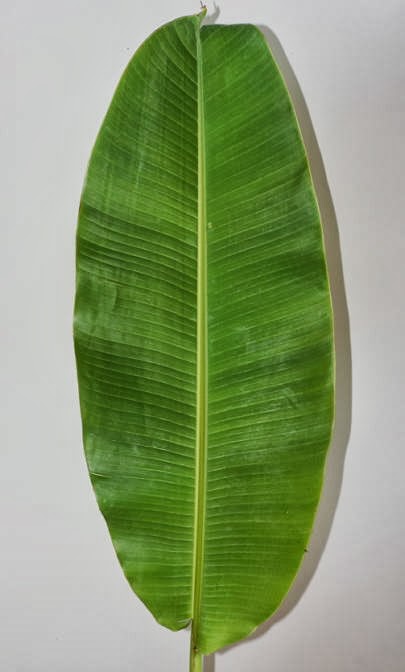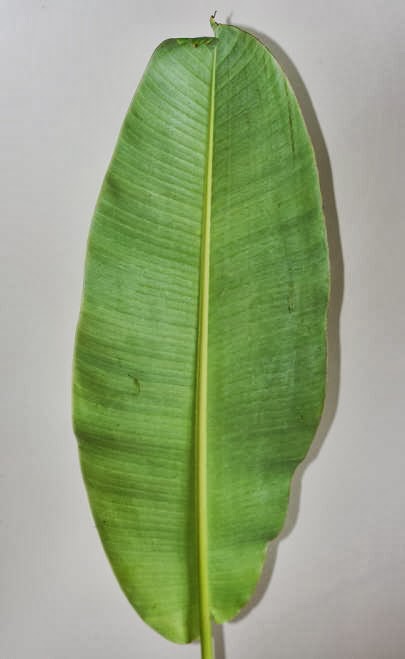 芭蕉の類は、葉っぱに切れ目が入っていることがあります。これは、木から落とす前から裂けていることもあるでしょうし、輸送の途中で裂けることもあるのでしょう。庭にバショウを植えてある家というのは、住宅地などに結構あって、そういうのを見ると、かなりべリべりに破けています。多分、風が吹いたくらいでも裂け易い葉なんだと思います。