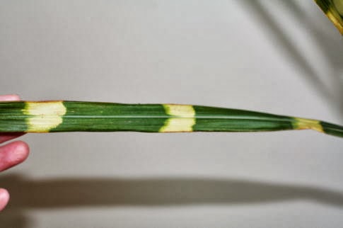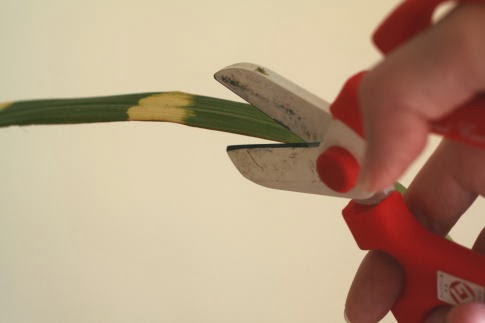 そんなときは、傷んだ葉っぱを丸ごと取らないで、傷んだ部分のみをカットします。要するに、茶色く巻いちゃった葉先をカットしてしまうわけです。(いけばな流派によっては、葉先カットをタブーとしているところもありますが、そういうものはあくまでも「その流の決まりごと」ですので、他流や一般の素人さんが「しちゃいけないんだわ」と思う必要はありません。ただし、花屋の人は要注意だよ! 品物の葉先カットをしてしまうと、「葉先カットNG流」の先生は買ってくれないばかりかバカにしてくるぞ!)