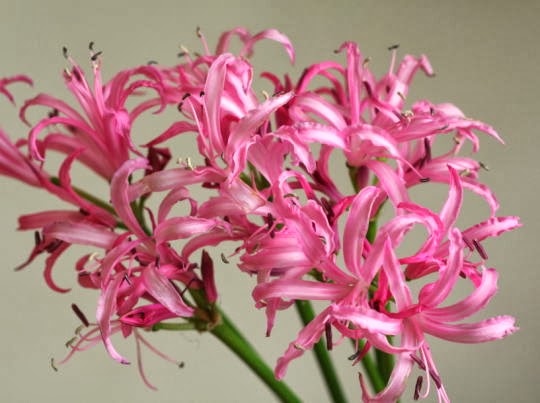 ネリネは、ヒガンバナ科の花です。そう思って見ると、たしかにヒガンバナのような花ですね。ヒガンバナと比べると、花は小振りですけど。